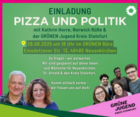 „Pizza & Politik“ am Donnerstag, 28. August 2025, um 18:00 Uhr im GRÜNEN Büro, Emsdettener Straße 13 in Neuenkirchen.